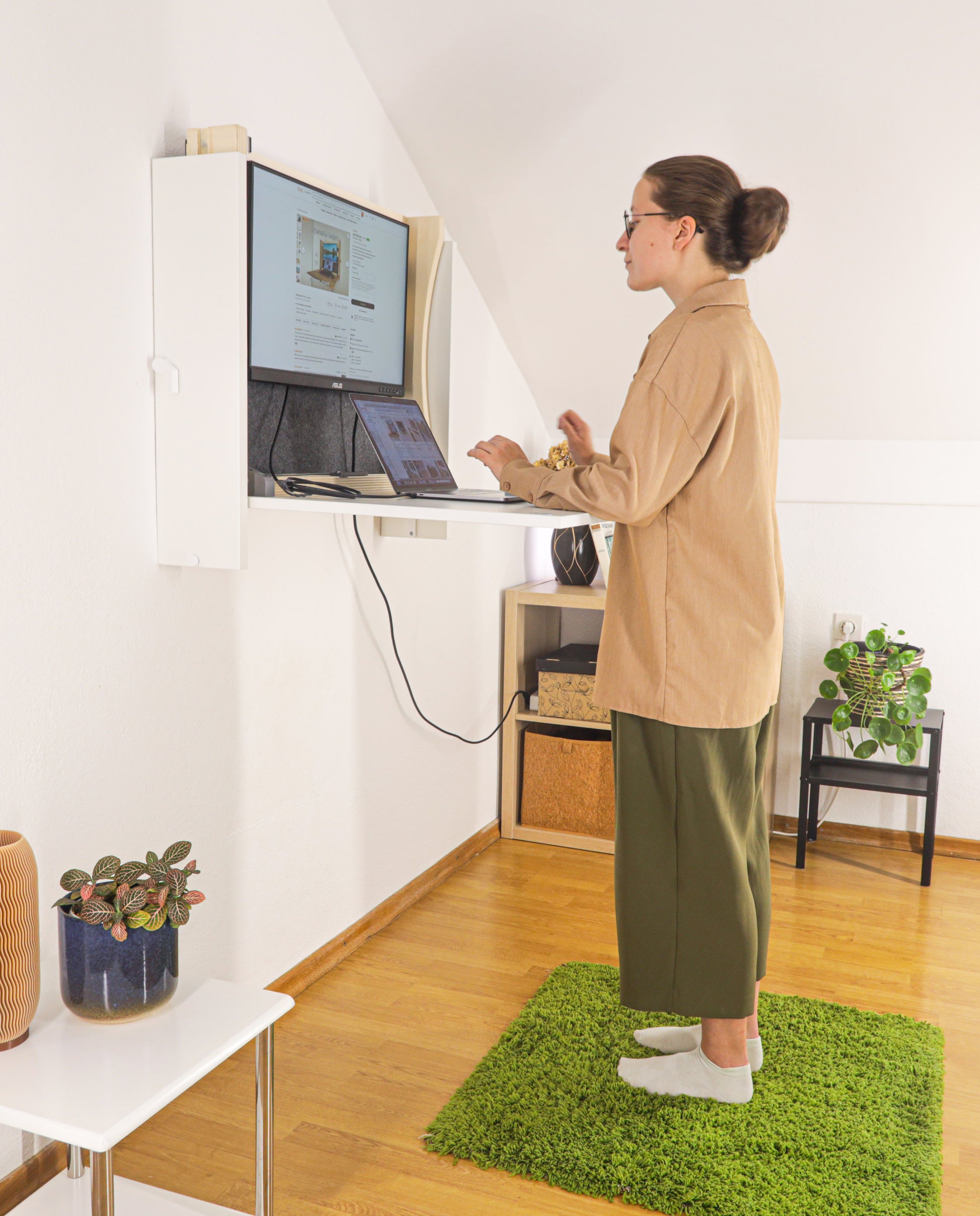 This multifunctional, wall-mounted workstation is designed to support healthy posture, whether you prefer to sit or stand while working. Ideal for small home offices and studios.